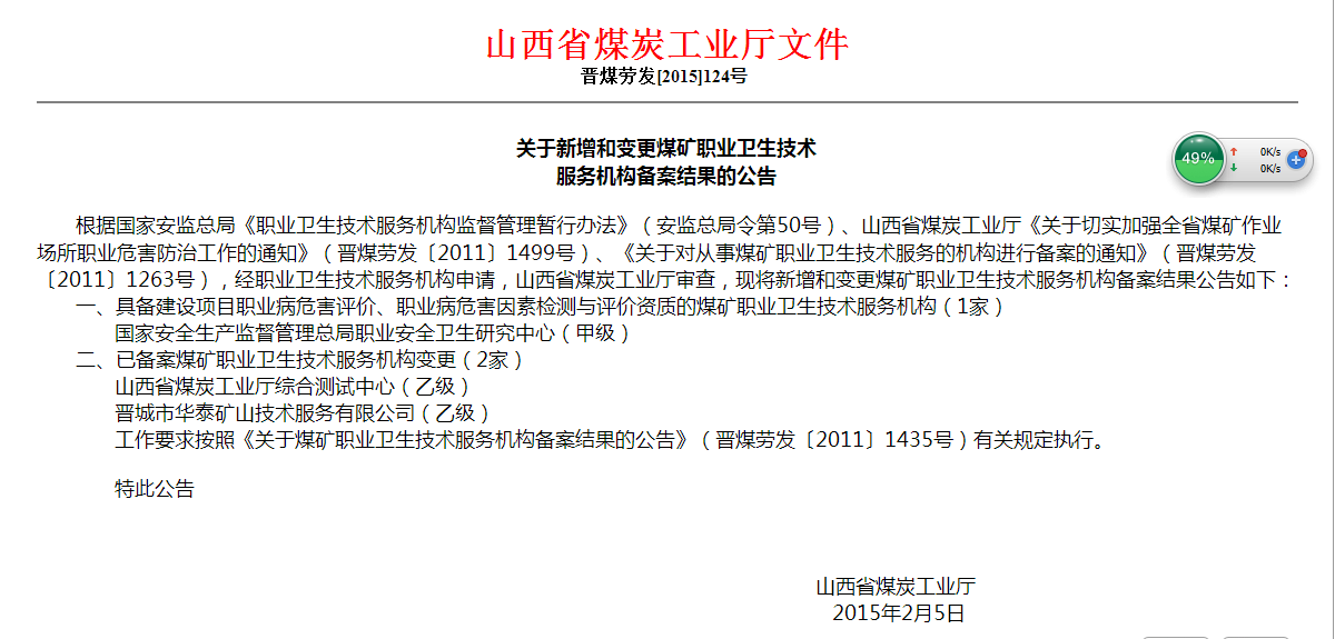 晉城國投華泰科技有限公司(以下簡稱華泰公司)是一家經(jīng)營性國有企業(yè),注冊資金1000.2萬元(由晉城市華泰礦山技術(shù)服務(wù)有限公司和晉城澤泰安全技術(shù)服務(wù)有限公司合并整合組建,國投全資)。公司持有山西省衛(wèi)生健康委員會頒發(fā)的《職業(yè)衛(wèi)生技術(shù)服務(wù)資質(zhì)證書》、山西省應(yīng)急管理局頒發(fā)的《安全評價機構(gòu)資質(zhì)證書》和山西省市場監(jiān)督管理局頒發(fā)的《檢驗檢測機構(gòu)資質(zhì)認定證書》等資質(zhì),設(shè)施設(shè)備、能力、資質(zhì)配套齊全。...【詳細信息】